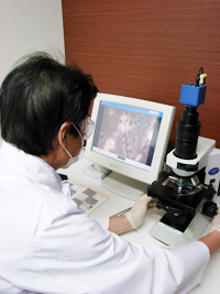 特殊な顕微鏡を使って口の中の菌を観察します。スピロヘータ類がいるかどうかが感染の目印になります。